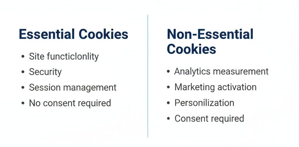 Essential cookies are the baseline. They keep a website functional, secure, and usable. Without them, even basic actions like logging in, submitting a form, or completing a checkout may fail.