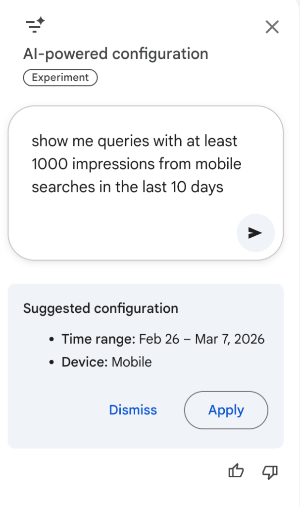 Instead of building reports step by step, you describe what you want to see and Search Console configures the view automatically. It doesn’t replace SEO thinking. It accelerates it.